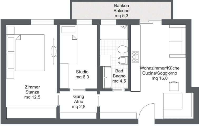 For sale is a light-flooded 2 -room apartment on the 4th floor (with elevator) in Via San Vigilio, which offers a modern and comfortable home with a net living space of 43 m² .